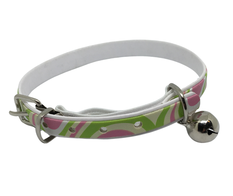 Cat collar with psychadalic colourful swirls. Great looking collars that also have the important elastic safety feature near the buckle.