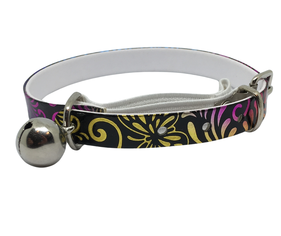 This designer cat collar not only has great detail and vibrant colours but has that important elastic safety feature near the buckle. This safe cat collar is also great for kittens (you may just need to add an extra hole and cut the excess off), it also has a loop to add any cat ID tags. With the safety feature being elastic there is no worry that a buckle on a breakaway cat collar will not release.